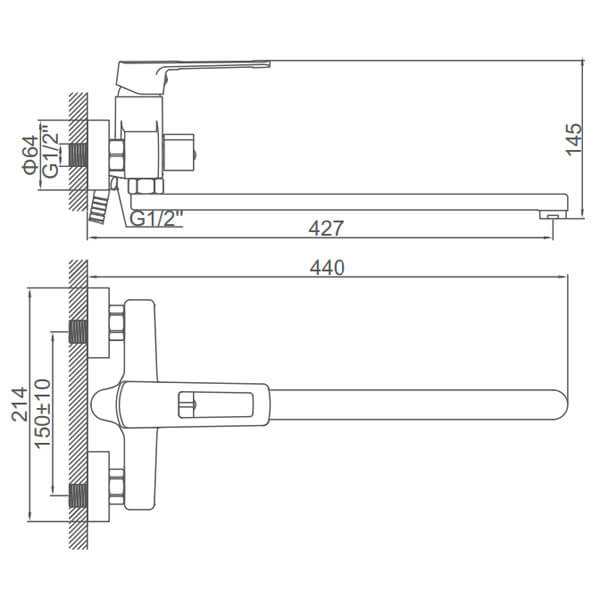 2. Настенные смесители — классическое решение, которое экономит место, отлично подходит для ванных комнат любого размера и устанавливается непосредственно на стену.